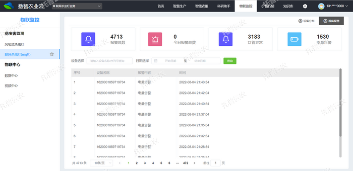 4、風(fēng)吸式茶園殺蟲(chóng)燈支持手機(jī)App與Web端控制,具有豐富的狀態(tài)信息展示,足不出戶就可以了解一切,如地理位置、設(shè)備編號(hào)、基地名稱、物聯(lián)網(wǎng)卡卡號(hào)、剩余流量、卡有效期、GSM天線連接是否正常等故障報(bào)警信息??蛇h(yuǎn)程控制、查看設(shè)備的當(dāng)前工作狀態(tài)、信號(hào)強(qiáng)度、電量使用等情況。